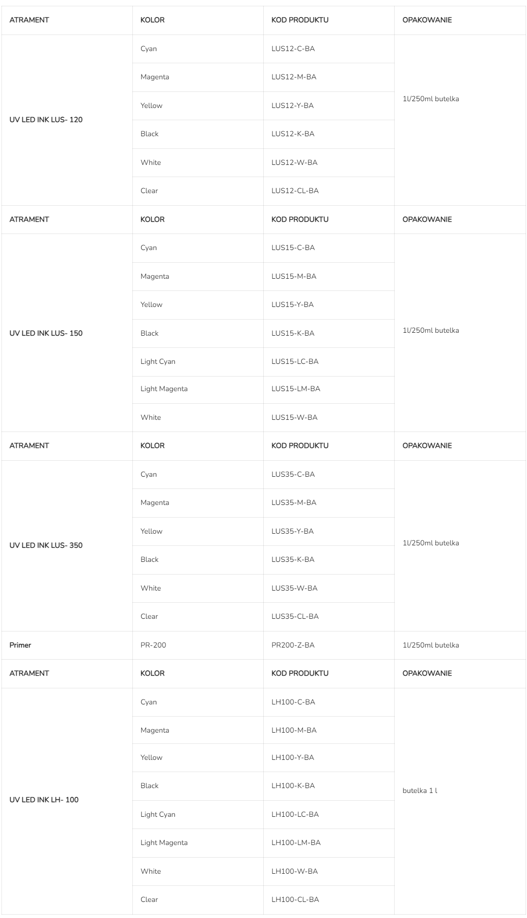 Atrament | Rodzaj | Atrament utrwalany UV; sztywny: LH-100 (C,M,Y,K,W,CL); rozciągliwy: LUS-120 (C,M,Y,K,W,CL); LUS-150 (C,M,Y,K,W); LUS-211 (C,M,Y,K,W)/LUS-350 |