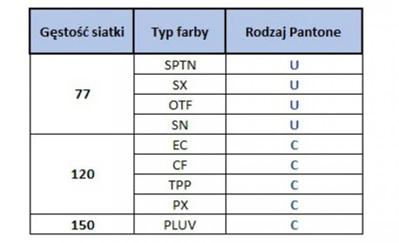 W związku z tym, że zmiana gęstości siatki sitodrukowej, powoduje zmianę nasycenia koloru drukowanej farby, nasza mieszalnia przygotowuje kolor zgodnie ze wzornikami kolorów na siatki opisane w poniższej tabeli.
